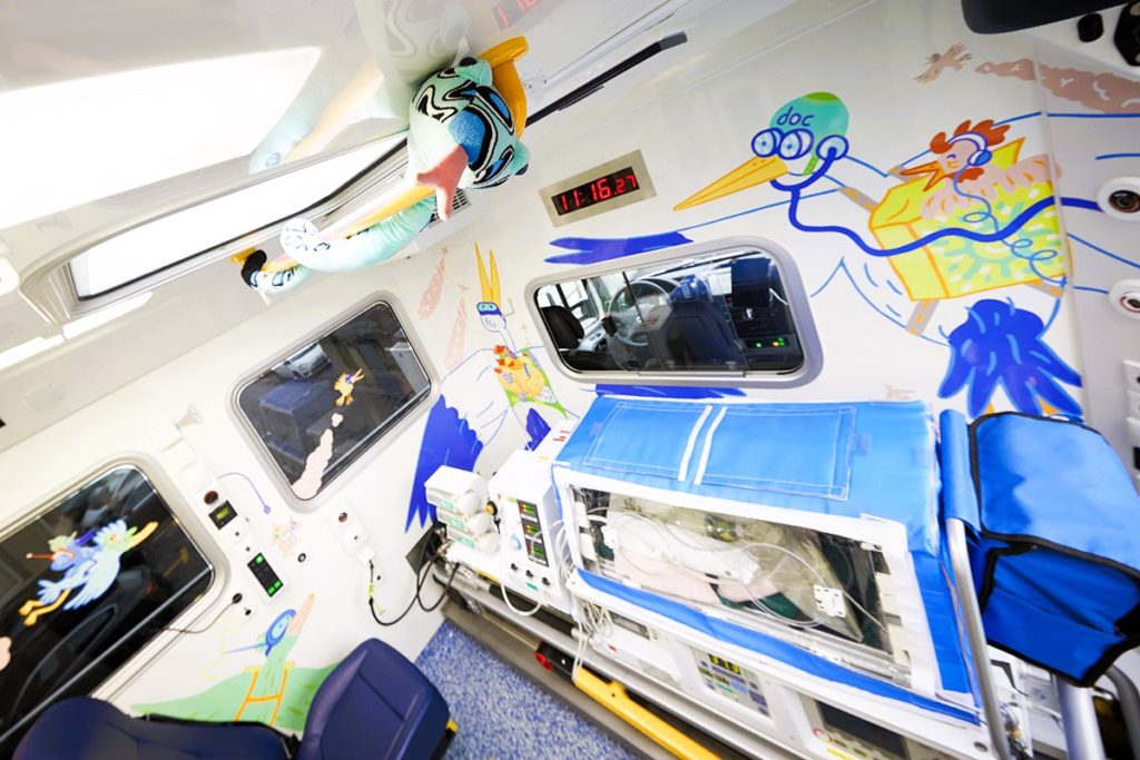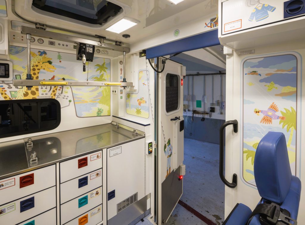 Ce véhicule dédié à la néonatalogie est à disposition du CHUV pour le transport de nouveau-nés. Le transport des bébés se fait à l’aide d’un incubateur équipé de différents appareils respiratoires, le tout monté sur un brancard. Les soins sont assurés par le personnel du pavillon de néonatalogie du CHUV.