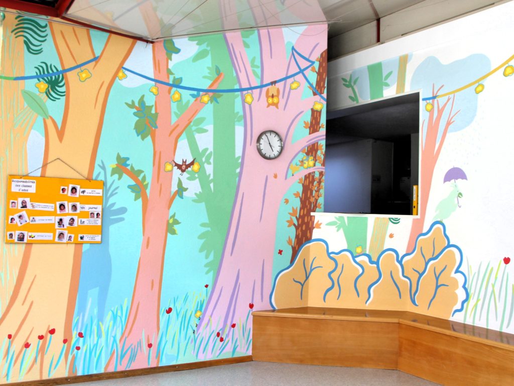 L’école de pédagogie spécialisée de l’Orée (Fondation Delafontaine) est fière de disposer d’une création originale et unique des artistes de Paint a Smile, dont les dimensions sensibles et délicates offertes sont immenses. Les décorations mettent en scène le monde et permettent à chaque enfant et jeune de se rêver à la lisière d’une forêt, au bord d’un étang…et de se vivre dans un espace plus grand que celui qui l’accueille. La force de ce spectacle est de soutenir l’imagination des élèves dans des rendez-vous quotidiens. L’équipe pédagogique y participe en s’inscrivant dans une narration aux tonalités du décor.