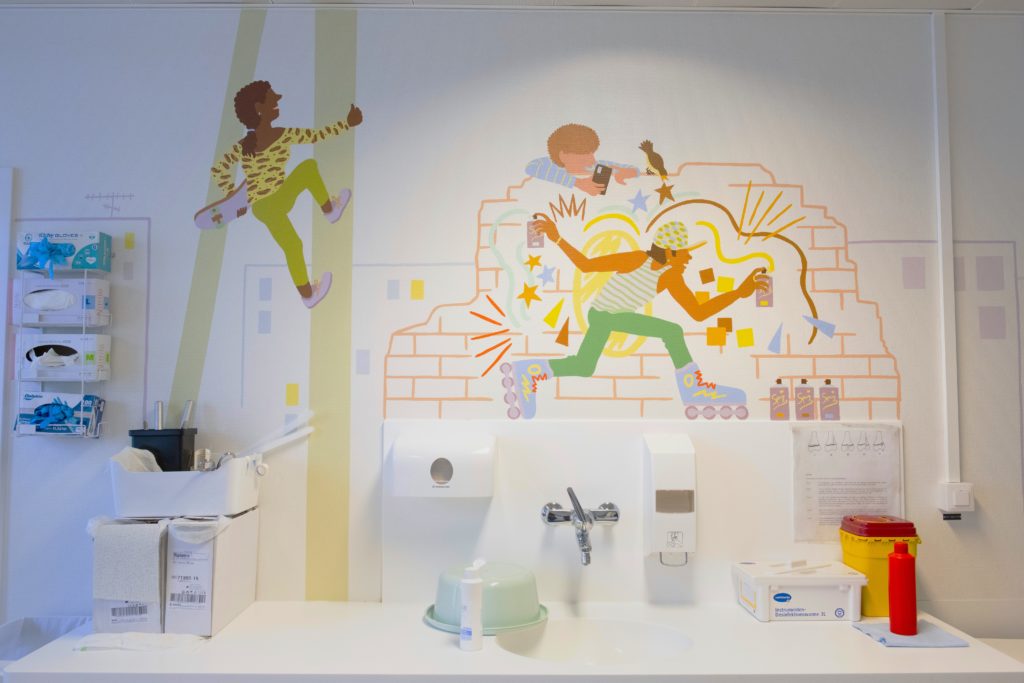 Le service d’hospitalisation pédiatrique bénéficie de décors adaptés créés sur mesure par Paint a Smile, qui emmène les jeunes patients pour un tour du monde éducatif et humoristique. La Néonatologie de l’Hôpital de Kiel accueille l’arrivée de presque 2000 bébés par année, désormais entourés de décors aux couleurs douces et bienveillantes pour ces moments si intenses.